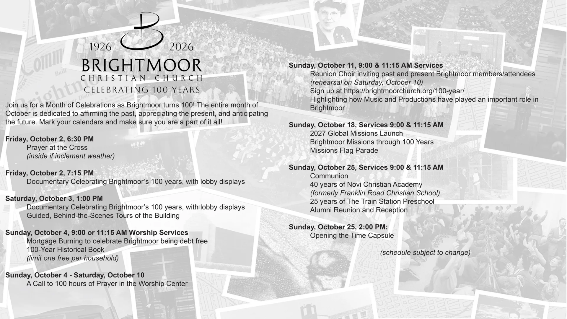 We invite you to be with us next October 2026, when our Brightmoor Church family will celebrate each Sunday with a special honor for our 100-Year Anniversary! Whether you have been with Brightmoor for a lifetime or are new to the church, there will be something for everyone.